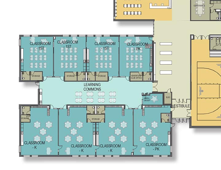 Because the concept of community and shared learning is central to the visible learning approach, visibility and transparency of the learning programs throughout the facility is vital. At Stillwater Area Public School’s Brookview Elementary School (currently in construction), grades are paired into wings – K-1, 2-3, and 4-5 – instead of placed along the traditional double-loaded classroom corridor. The wings encourage a team-teaching/collaborative approach and a community environment by featuring a shared space in the middle of classrooms for group learning, active learning activities, and opportunities to connect students and teachers with common academic goals and attitudes.