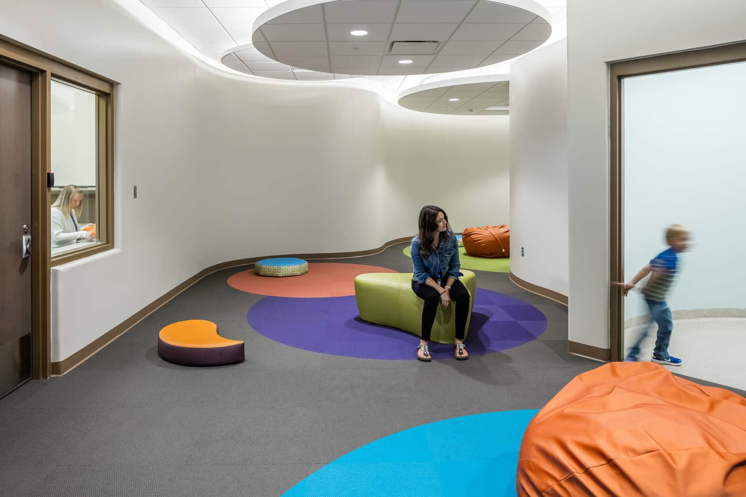Working with state fire inspectors, even fire alarms are specific for this special student population, replacing loud alarms and strobe lights with calm voice alarms and LED reader signs more often found in mental health facilities. Not specific to Pankalo, the fire alarms were one of many successful strategies that carried over from Karner Blue, including soft, movable, child-friendly furniture; rubber flooring and strategically used carpeting; and nesting windows, this time made deeper for students to sit inside.
