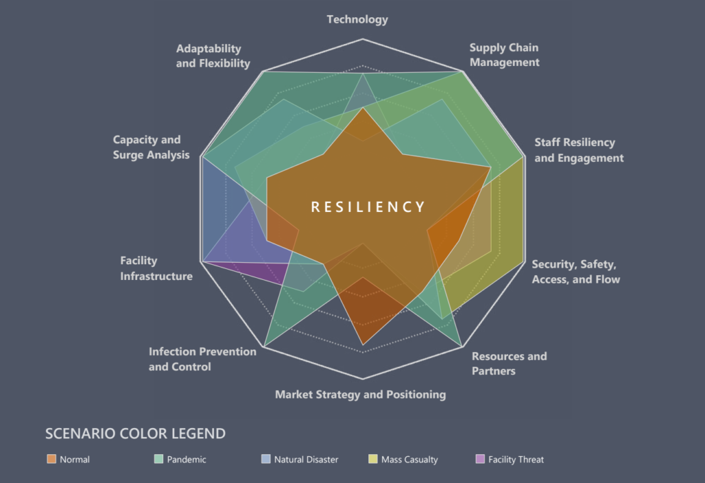 Facilities and infrastructure are then designed for disruption absorption – alternative care sites, alternative care delivery methods, flexible mechanical systems, adaptable spaces, alternative traffic flows, as well as support for staff wellness under unrelenting stress. By creating a dialogue between all the various parts of an organization, a dynamic plan is shaped to help organizations maintain the integrity of their operations through adversity.