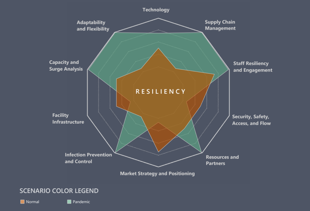 While an understatement, COVID-19 proved to be anything but normal, and in its sweep across the nation, it exposed a deficiency in our collective healthcare system. Missing from the Triple Aim was “resiliency,” a word often applied to physical structures, not so much to operations. As organizations pursued the Triple Aim, with a strategic and structural shift from inpatient to outpatient care, facilities and campuses reflected that shift, designed for consumers of care with a focus to keep the community healthy and reduce the need for hospitalization.