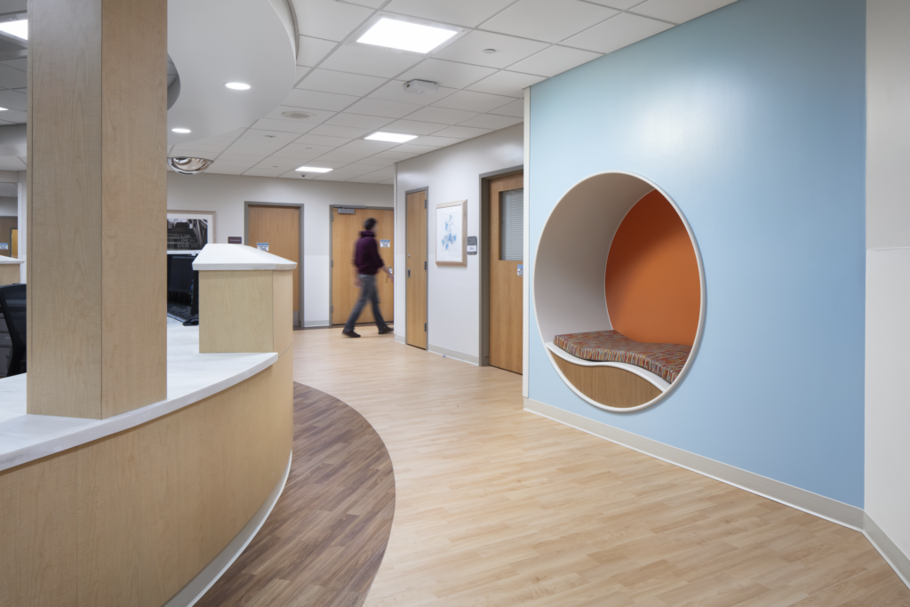 Inpatient Care: For patients requiring intensive care, inpatient facilities can hold a negative stigma of being cold, scary, or confrontational. Ligature resistant measures, secure unit entries, and safe areas for staff are critical, but are only the minimum standard for design. BWBR’s Human-Centered Safety approach goes beyond this minimum, creating comforting, therapeutic environments that offer patients choice and control of their environment and improve healing and safety. Warm colors, abundant artwork, plenty of natural daylight, and an open nursing station are just a few elements at Regions Inpatient Mental Health Center that help patients feel welcomed and calmed. A central dayroom with comfy seating and private patient rooms with built-in desks, shelves for belongings, and private bathrooms help the unit feel home-like rather than sterile. UnityPoint Health – Meriter’s Child & Adolescent Psychiatry program is another example of a welcoming environment that prioritizes safety without feeling institutional. In pediatric facilities, pops of color and texture as well as engaging graphics and shapes result in a facility where children, adolescents, and their families feel comforted and empowered.