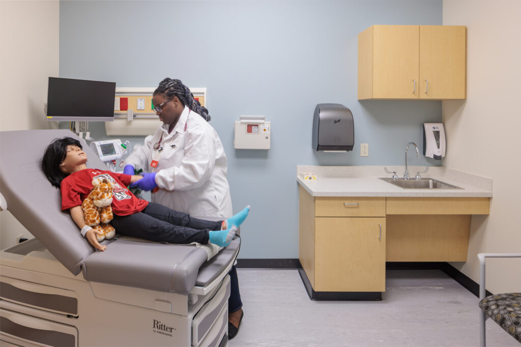 Through strategic programming, the team identified space needs that support both current educational goals and future program growth. The facility features simulation labs with state-of-the-art robotic patient manikins and other specialty environments like a birthing room, pediatric ICU, hospice suite, active learning classrooms, and skills labs. These spaces are designed to help meet the diverse learning needs of students, addressing a range of potential healthcare scenarios and career interests.