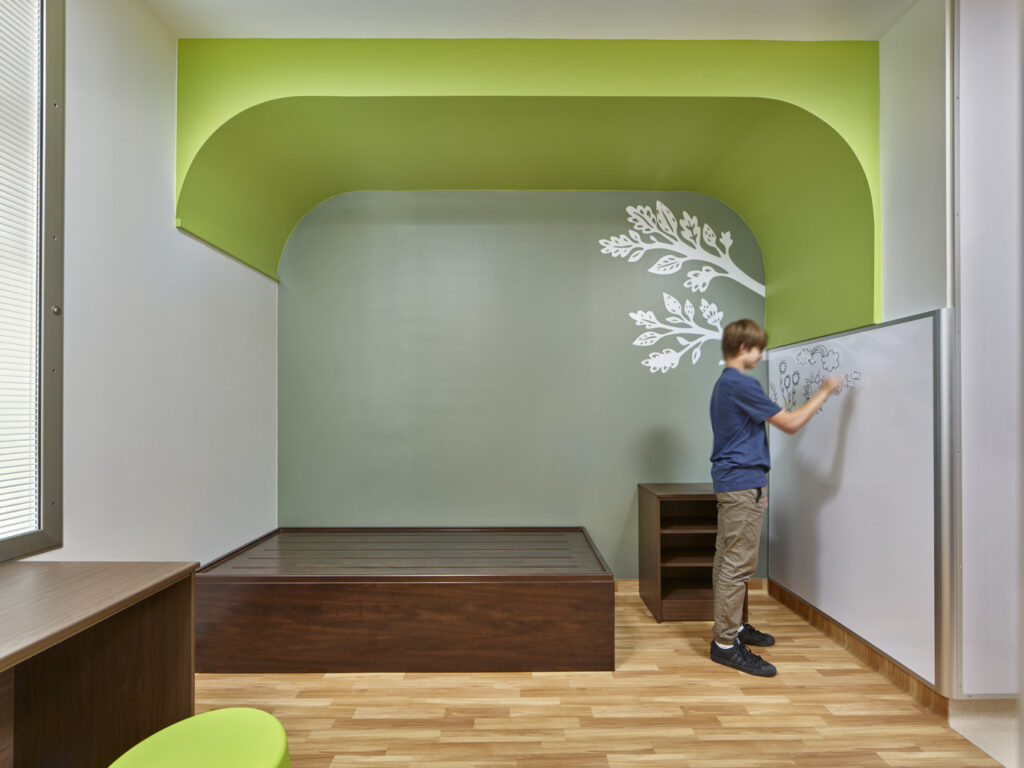 Child and adolescent units must accommodate a wide age range, sometimes serving patients from as young as five up to 17 years old. Because of this, spaces should be engaging and child-friendly without feeling childish. In some facilities, providing separation between child areas and adolescent areas is appropriate. In other settings, designers can identify solutions that appeal to both young children and older teens.