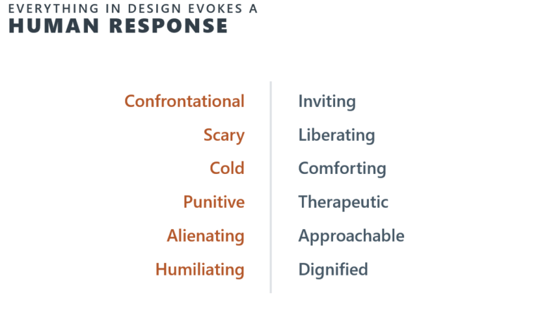 If the words on the left (below) are what patients often feel in a behavioral health space, will this support their healing and stability? Conversely, imagine the difference if the environment inspired the feelings on the right.