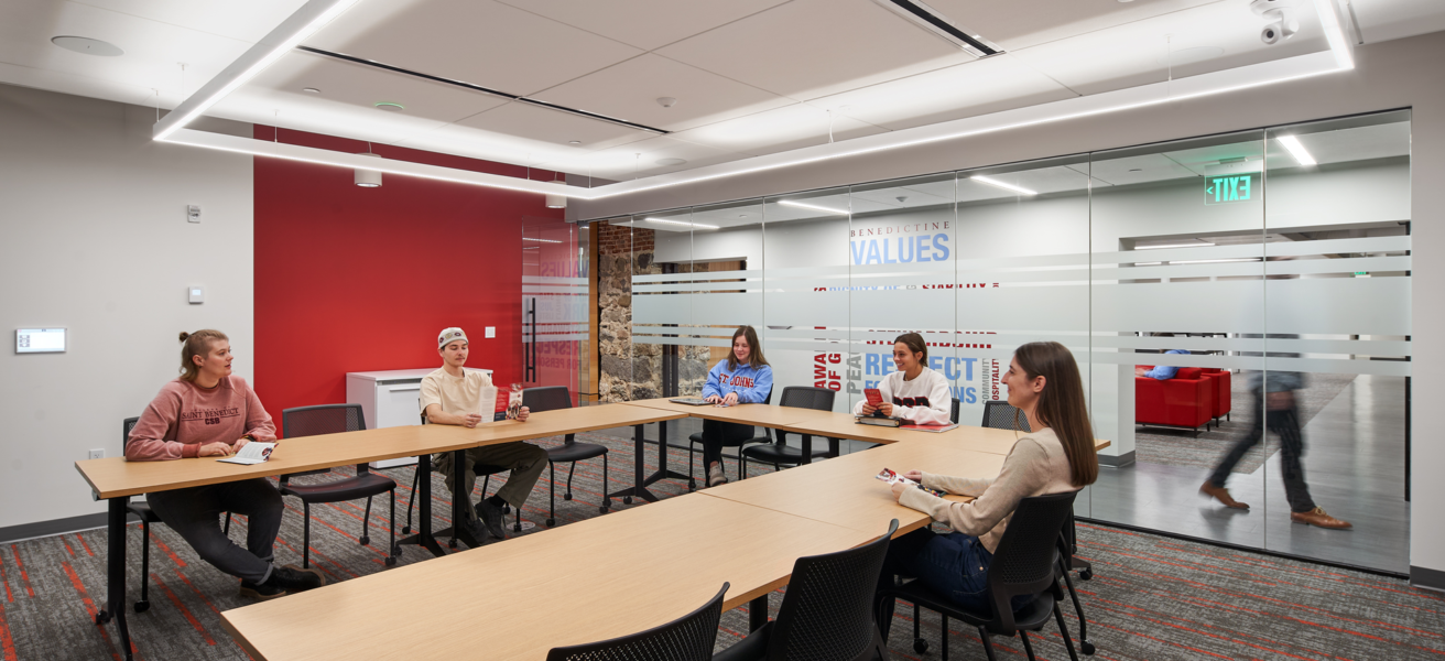 Housing offices for admissions, the Quadrangle building is a hub for a variety of university functions and has stood on the Saint John’s University (SJU) campus since the late 1800s. Saint John’s engaged BWBR to create an admissions center and collaborative workplace that captures the historic character of the space, located below a former abbey, while reflecting the modern SJU brand and meeting needs for both faculty and students.