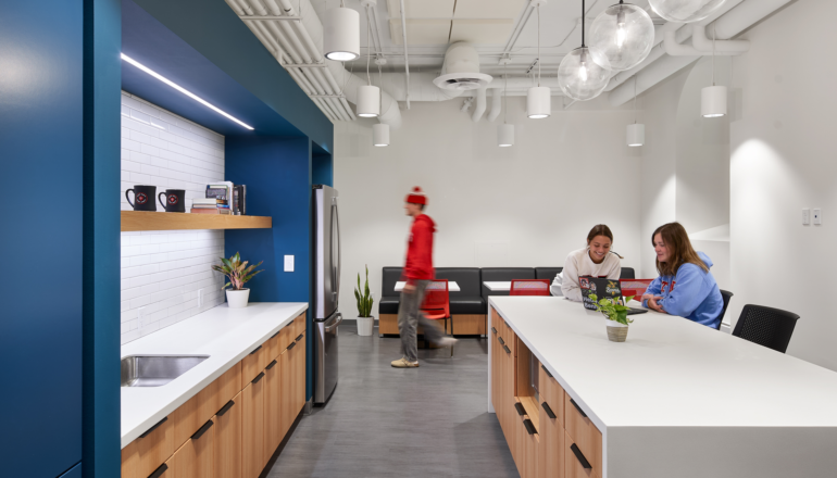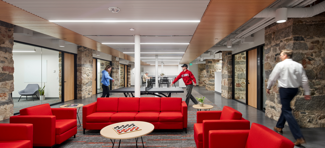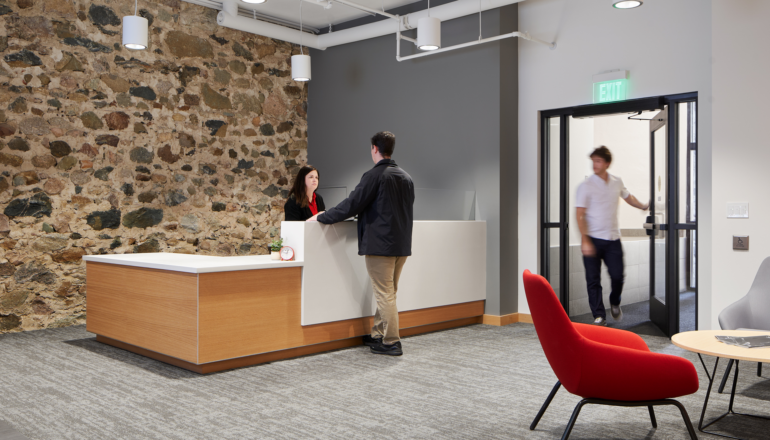 A refreshed admissions center provides prospective students with a welcoming glimpse into Saint John’s campus and community with a bright, modernized design that showcases the university’s mission. The renovation also creates a flexible, open workplace, enhancing collaboration between departments while maintaining privacy, carefully utilizing acoustics to reduce noise. Historic stonework was exposed throughout the building, providing a thoughtful balance between the new, freshened interior and original materials. Soft, dimmable lighting and generous access to daylight brightens the space along with pops of university colors.