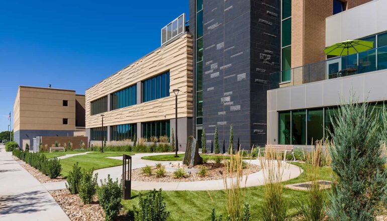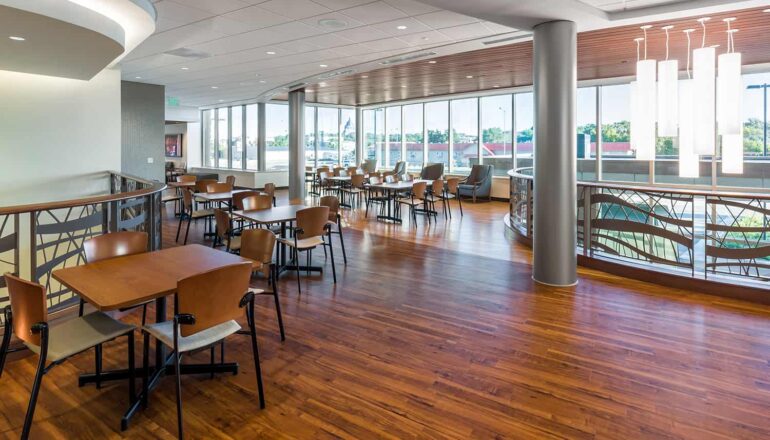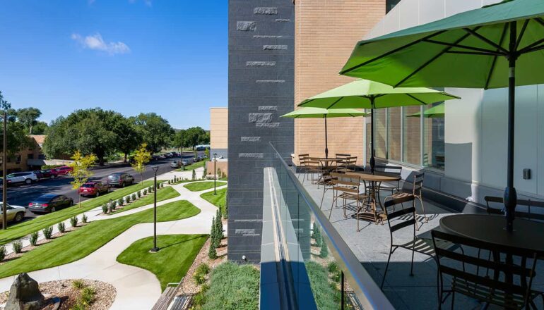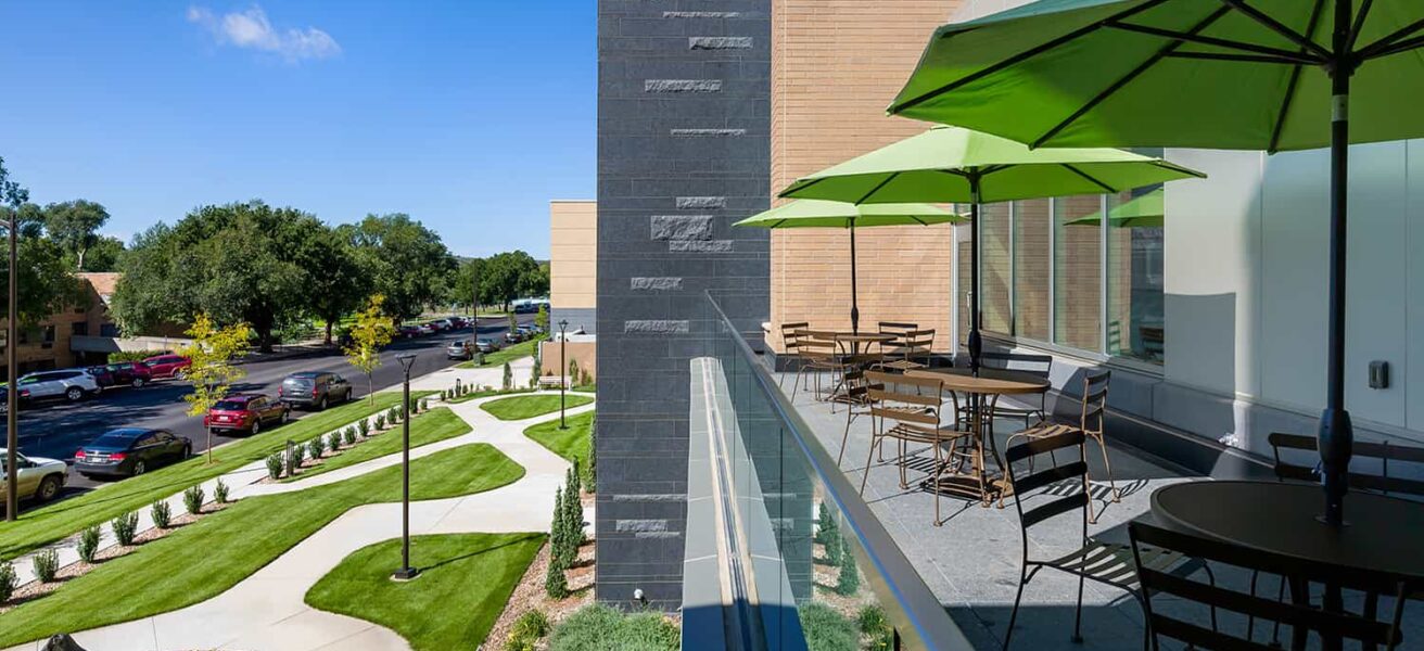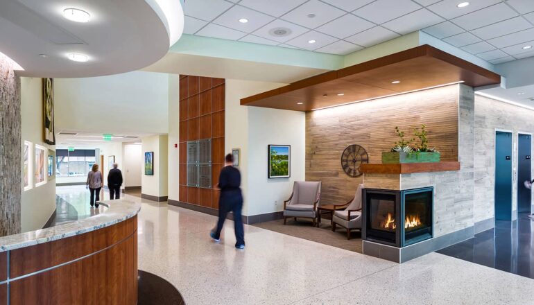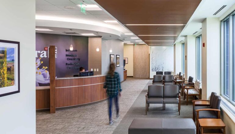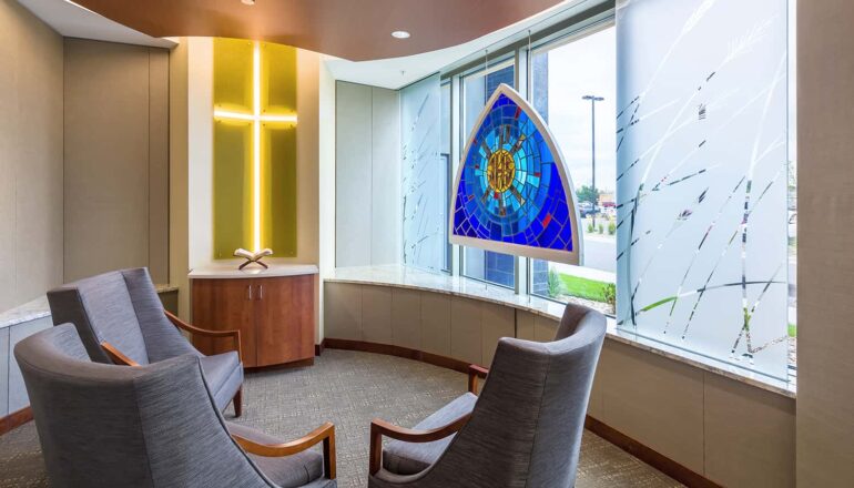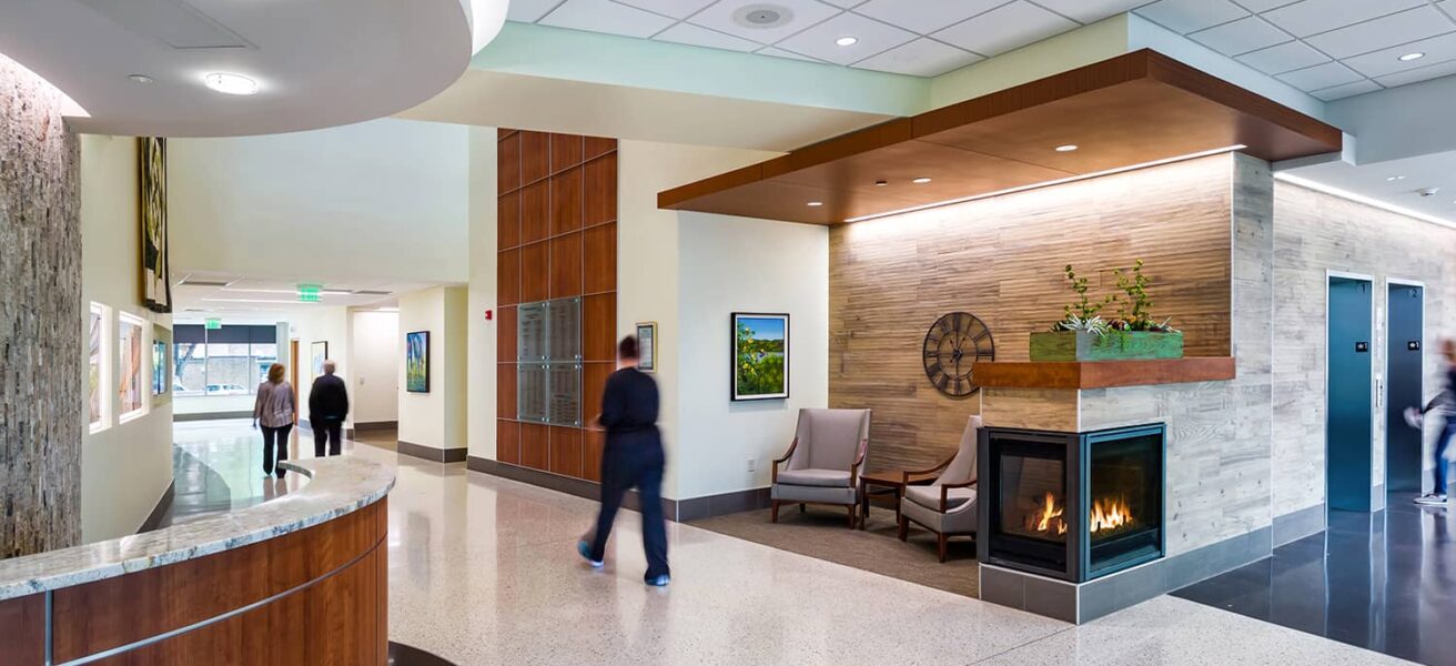 The three-story Helmsley Center connects to the existing St. Mary’s Hospital and Clinic. The building’s centerpiece is a spacious community atrium, complete with fireplaces and a piano to soothe patients and visitors into a peaceful healing space. Nature-inspired materials and patterns reflect the beautiful scenery that surrounds the Center, which patients can see as they recline in thoughtfully selected, heated treatment chairs. With treatment options in environments that feel like home, close to home, patients can return to what really matters in their lives – faster.
