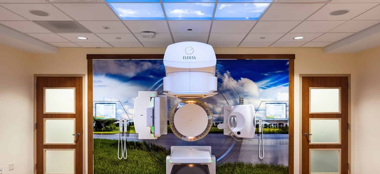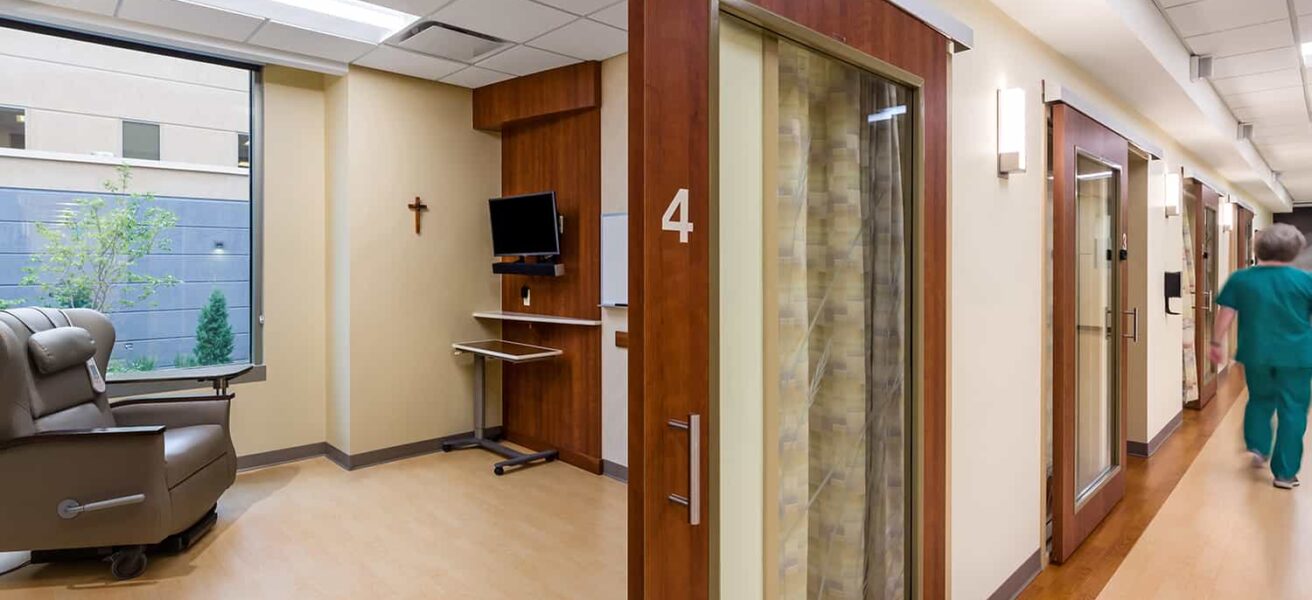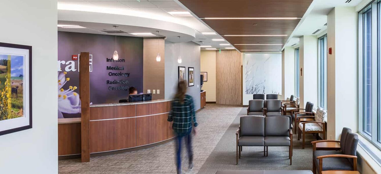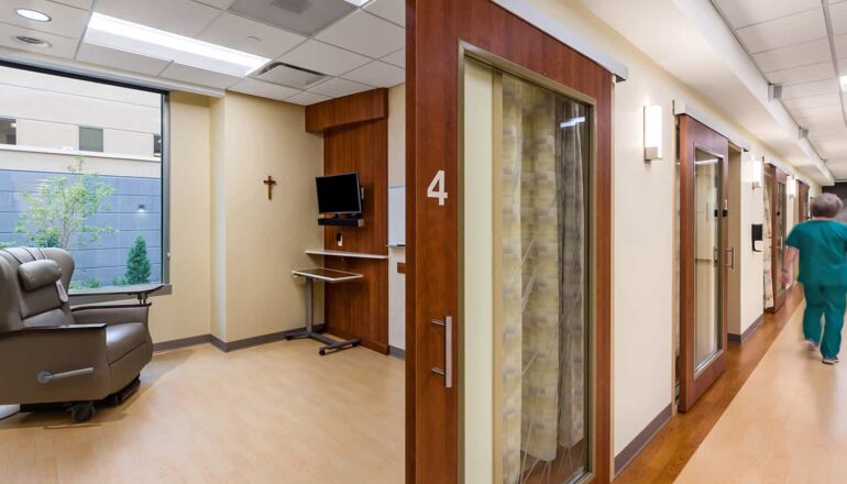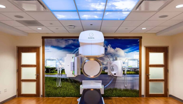 Cancer Clinic: Private infusion rooms, linear accelerator, procedure room, oncology rooms, cancer clinic pharmacy, meditation space, and wig/hat room