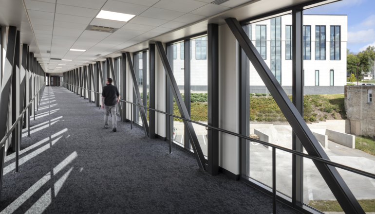 An enclosed pedestrian bridge crosses North Street to connect to an existing municipal parking ramp, which provides abundant parking for staff and visitors to City Hall.