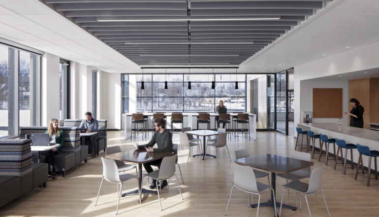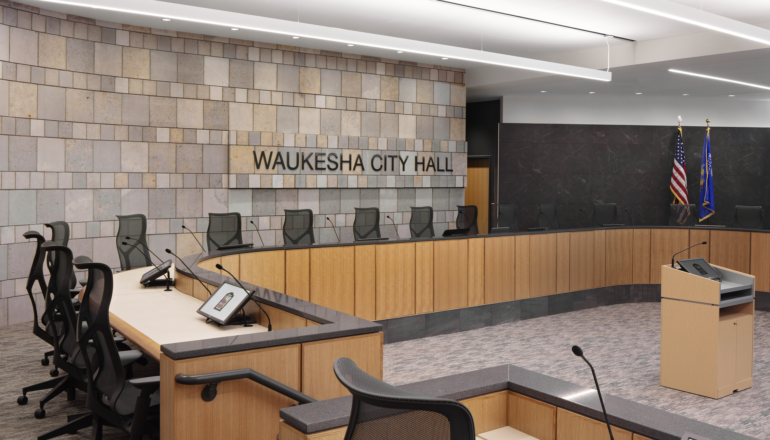 The new City Hall more than doubles the amount of usable square footage, with a large portion of the building dedicated to group meeting and public spaces. The spacious Council chambers are located on the main floor for easy wayfinding, with optimized sight lines for all and enhanced audio-visual technology. The workplace design creates open work areas so that staff can collaborate with multiple departments and effortlessly connect with leadership. Equitable access to daylight and warm, welcoming finishes combine to create a timeless yet modern design that celebrates the character and history of Waukesha.