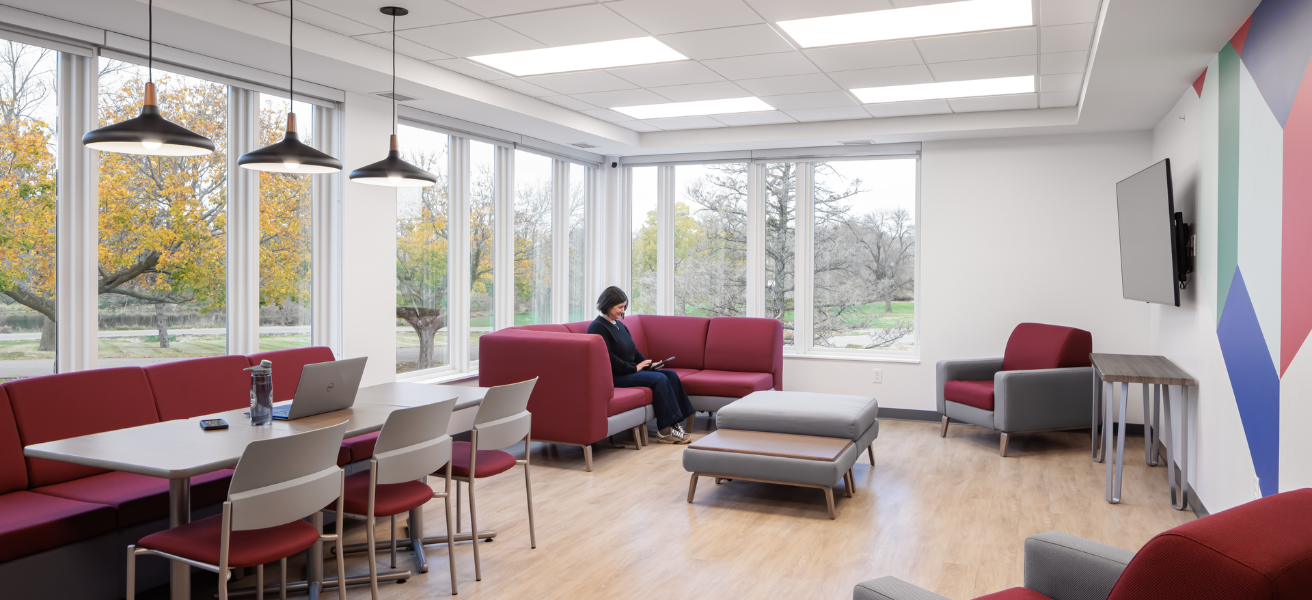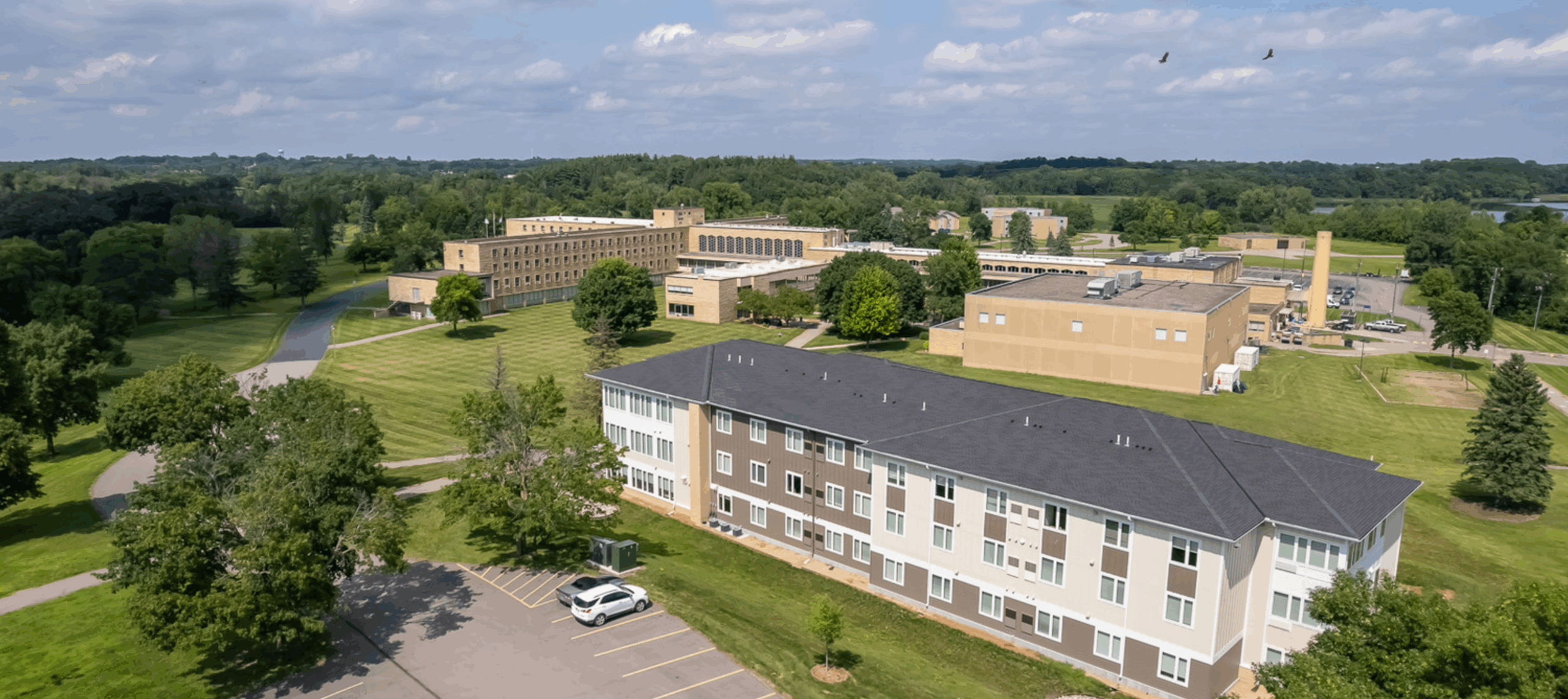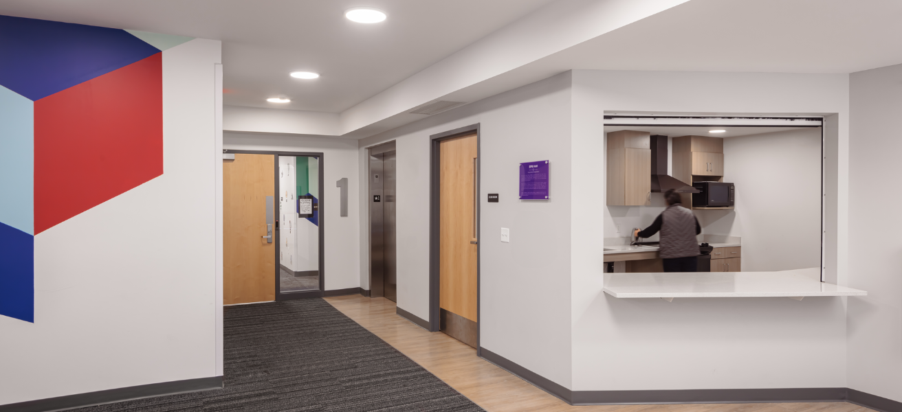New three-level building; suite-style living with 144 beds (48 beds in eight suites per floor); large community space, full kitchen, and study areas build community and feature homelike amenities