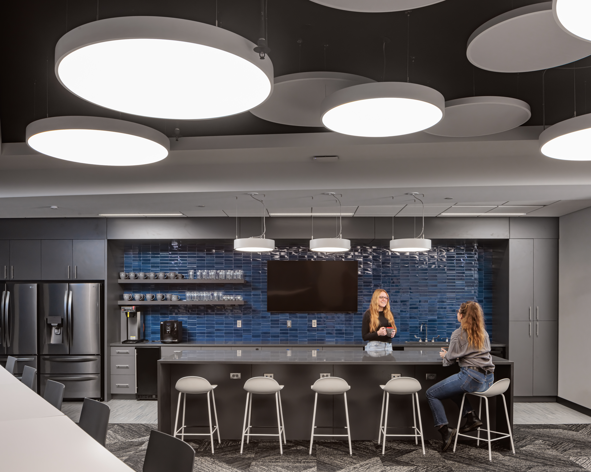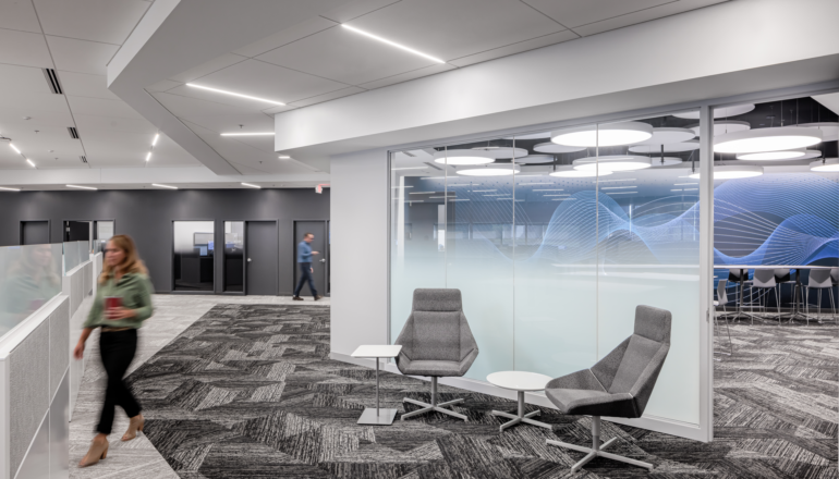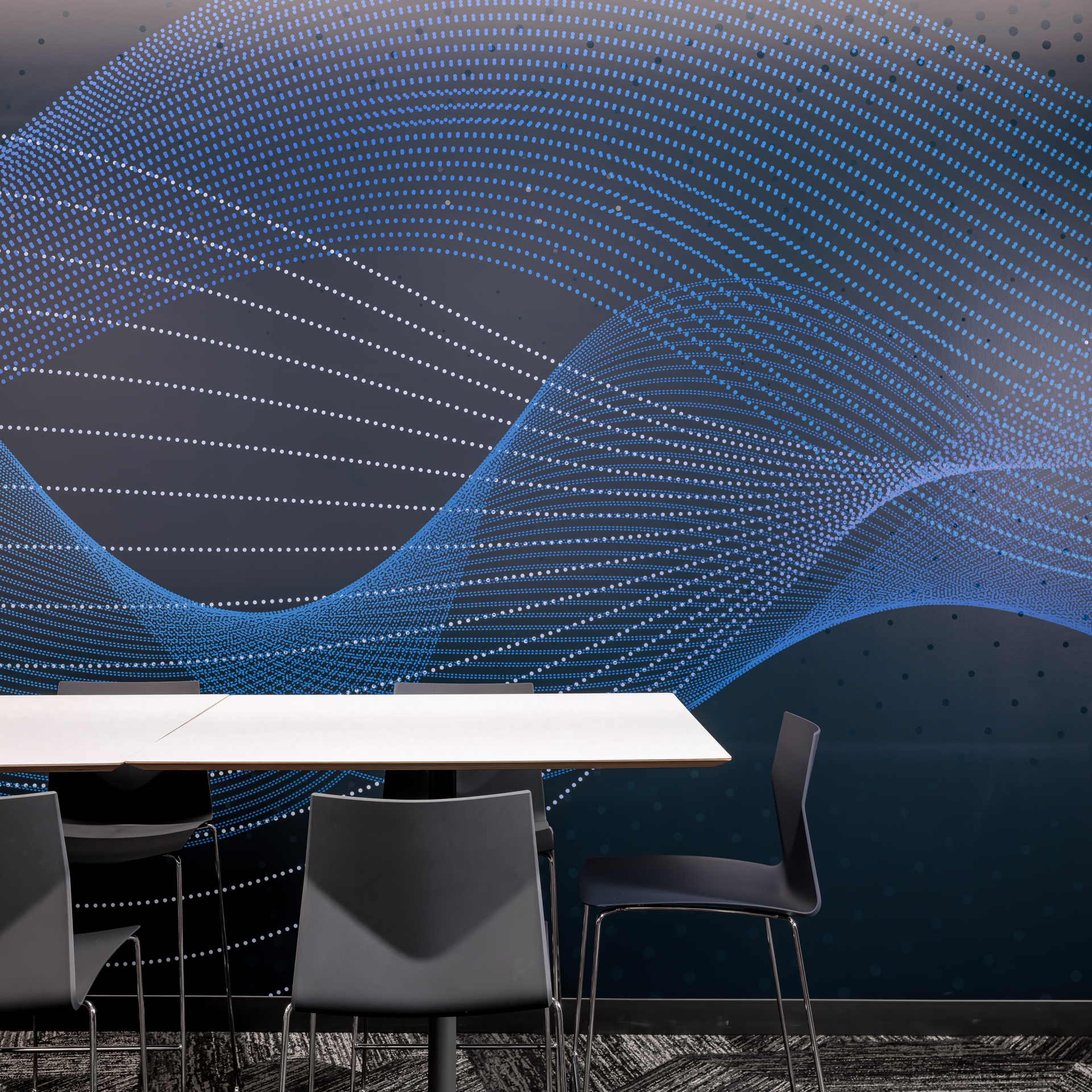 A custom wall graphic in the work cafe helps establish a visual identity inspired by the “bubble-cloud” and to further extend the brand and relate to the histotripsy technology. As with the technology, taking in the graphic from different vantage points gives a different perspective for folks to interact with, while also bringing energy and visual interest to the gathering space.