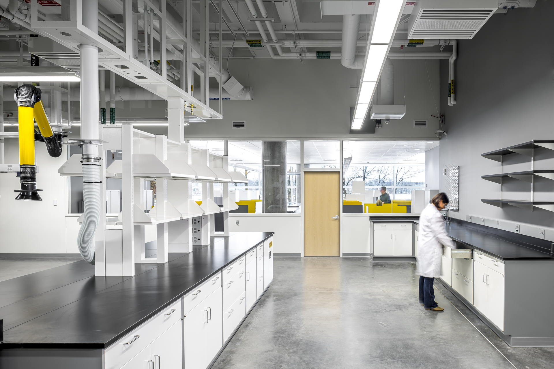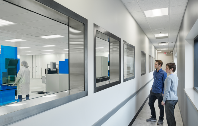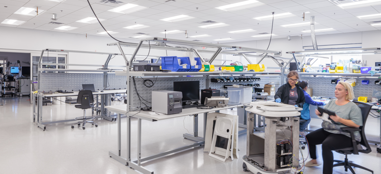 Office spaces for both focus and collaboration, work café, education center for clients and doctors, production assembly space, mechanical and electrical lab spaces, custom wall graphic