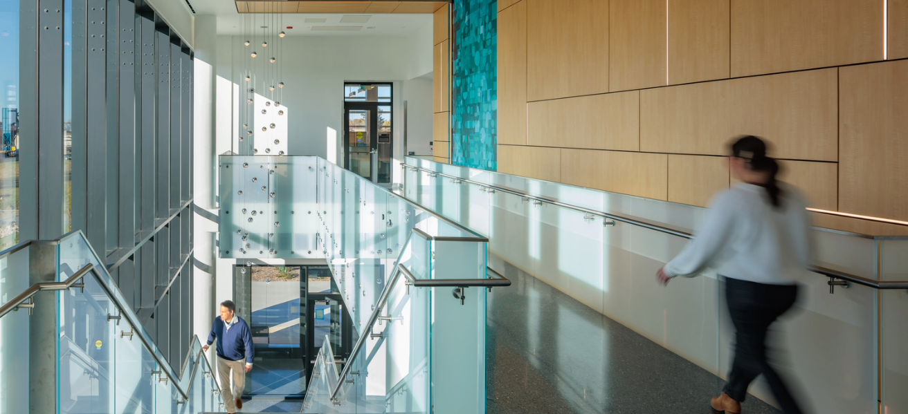 The new facility grows BRC’s capabilities for microbial cell production services, R&D, and consulting, and is intended to be the start of the new Biotech Quadrant on the Saint Paul Campus. Sustainability features include a solar-thermal wall, rooftop PV capabilities, expansion of district utilities, and B3 SB 2030 energy standard compliance. A custom two-story art installation incorporates scientific imagery at micro and macro scales, including cells, bacteria, algae, plant cross sections, neurons, and more.