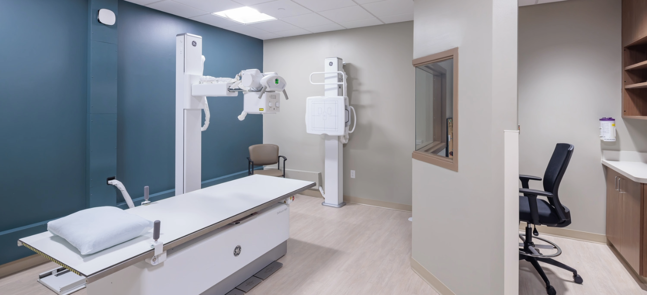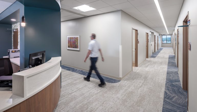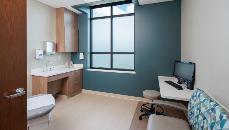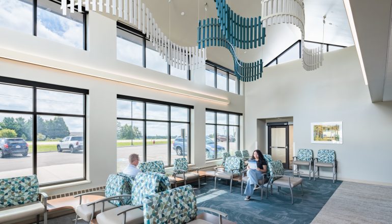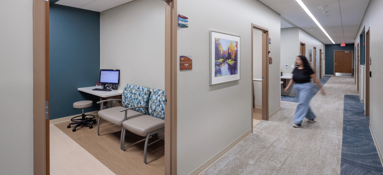 The team drew inspiration from the bluffs, lakes, and hills of the area, incorporating custom ceiling baffles that mimic the dynamic movement of water. Flooring patterns were inspired by lakes and the land around them, creating paths that support wayfinding. Exam rooms are modern and welcoming, bringing a comforting experience to patients while supporting staff in providing high-quality care.