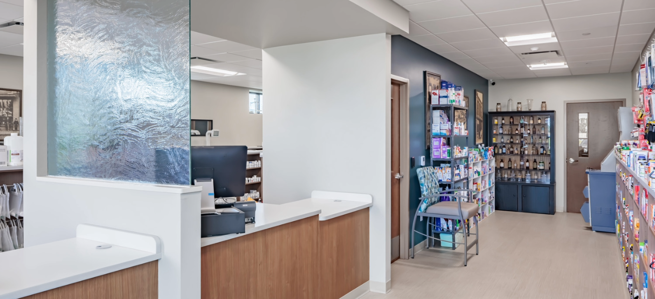 Flexible exam rooms accommodating growth into the future; imaging and lab services; on-site pharmacy for patient convenience; the clinic’s lower levels contain a chiropractor clinic and community gym; design inspired by the surrounding natural elements and local environmental features
