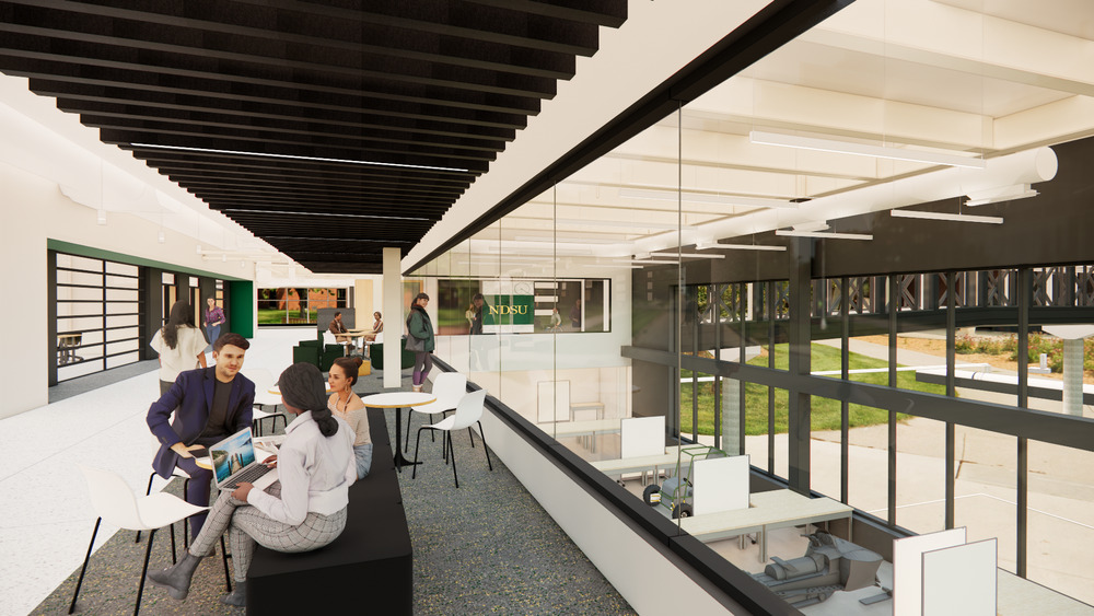 Flexible teaching, research, and learning spaces will adapt to student, faculty, and staff needs, including labs, officing, classrooms, conference and huddle rooms, and open student study spaces. The Precision Agriculture program features a state-of-the-art high-bay research laboratory large enough to accommodate full-size agricultural machinery. New skyways will link residence halls to the north with the Memorial Union to the south, connecting the entire campus core. A reflection room offers a quiet space for prayer and meditation. A pair of inset metal circles within the concrete floor offers an homage to the distinctive round building that once stood on the site.