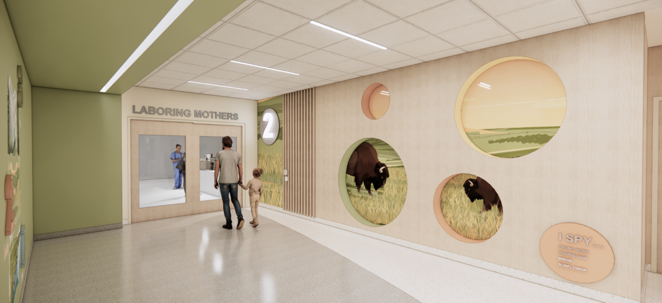 The three-story facility, which will be attached to the existing hospital, draws inspiration from the natural landscapes of South Dakota’s West River region, Black Hills, and Badlands. BWBR’s interior and graphic design teams worked closely on custom wall coverings and palettes reminiscent of the wetlands for the first floor lobby and outpatient clinic, grasslands for the second floor NICU, and forest floor for the third floor postpartum unit. The concept puts an emphasis on simple wayfinding while feeling welcoming for both mothers and children, with calming natural elements in women’s spaces and child-friendly imagery offering positive distractions in pediatric spaces. The design of the exterior utilizes the same natural stone and dark metal panel accents as the rest of the campus, creating a cohesive architectural language that reinforces the Monument Health brand.