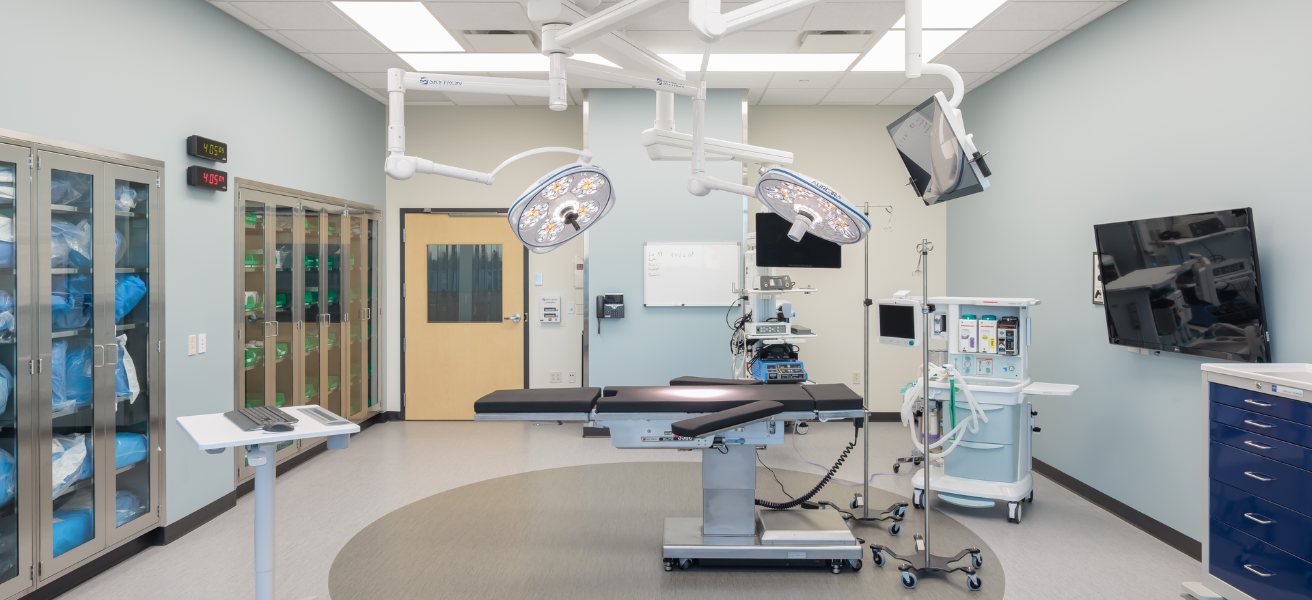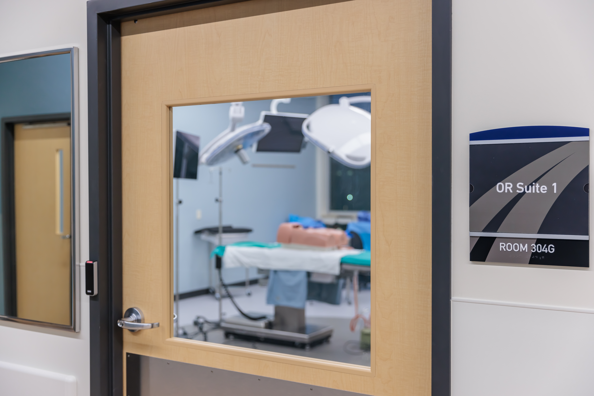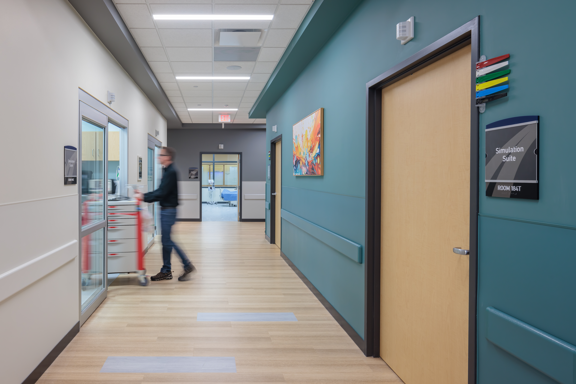 Surgical Tech components include four ORs, a clean core (sterile storage), a student study room where they can access the instruments and trays, control room, gowning/locker room, and a sterile corridor (including scrub sinks). Simulation components include a finish refresh of existing Trauma, Delivery, Patient, and Apartment sim rooms and control rooms; the addition of two exam rooms; storage, debrief and office spaces; and standardized patient changing room.