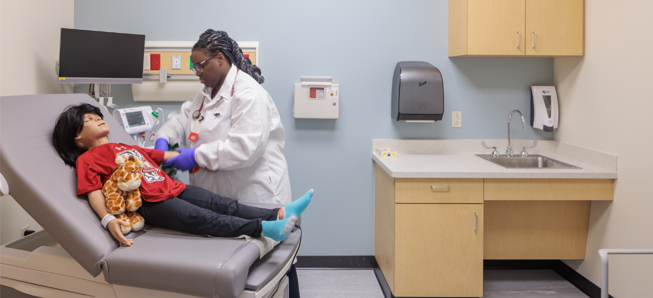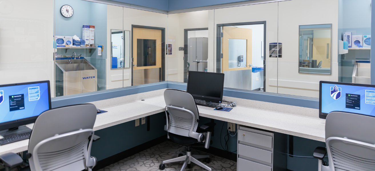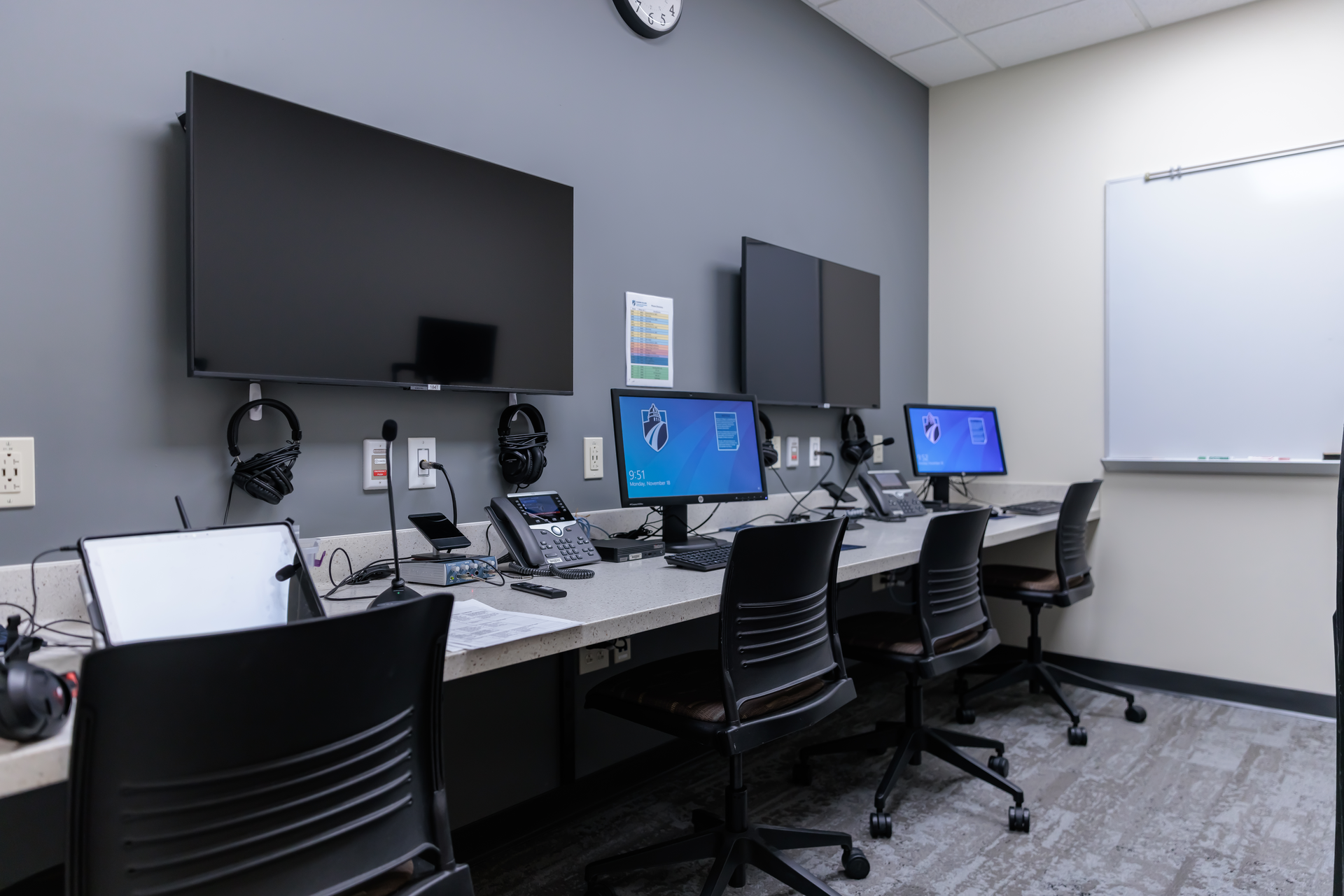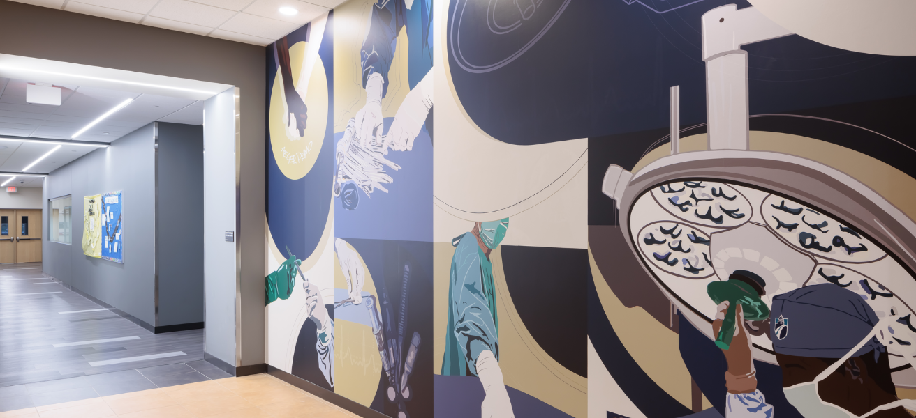 Surgical Tech components include four ORs, a clean core (sterile storage), a student study room where they can access the instruments and trays, control room, gowning/locker room, and a sterile corridor (including scrub sinks). Simulation components include a finish refresh of existing Trauma, Delivery, Patient, and Apartment sim rooms and control rooms; the addition of two exam rooms; storage, debrief and office spaces; and standardized patient changing room.