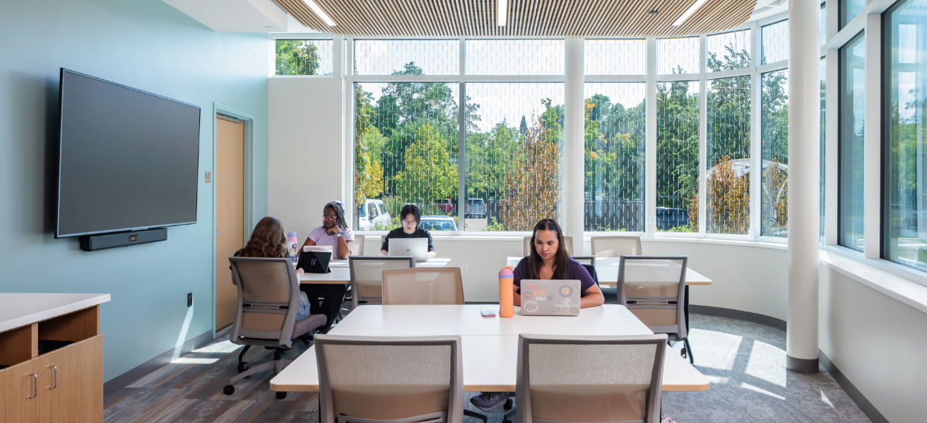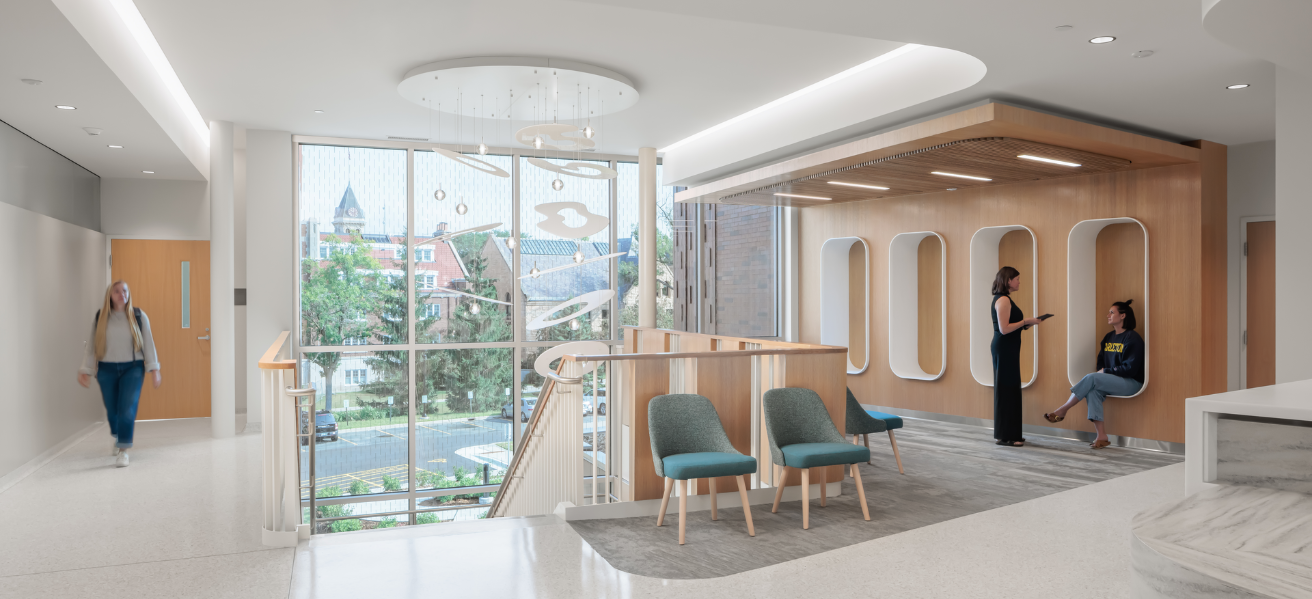 Sustainably designed to LEED Platinum standards, the fully accessible facility includes six exam rooms and 12 counseling offices; spaces for waiting, group counseling, and meditation; rooms for alternative therapy and relaxation; and spots for student telehealth sessions. The building also serves other support systems, with the flexibility to change over time as needs and priorities evolve. It is sound-proofed for privacy and 75% of spaces have access to natural daylight.