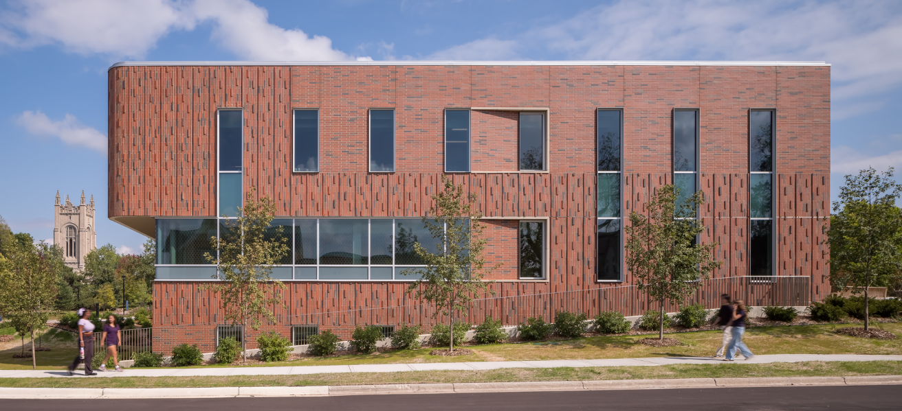Two main volumes make up the three-story building, flanking a glass-walled central public space that direct views back to the adjacent academic center of campus. Textured red and dark brick patterning allows tight rounded corners and gives the building a distinctive feel. The entries are marked with contrasting light precast elements, leading to the central space. Inside, a central stair combined with an artistic lighting fixture makes it easy for people to navigate the building. High windows above interior doors allow natural light to penetrate the building interior while preserving privacy in all rooms. The warm and comforting interior features wood accents – including comfy seating niches – and a soothing neutral color palette.