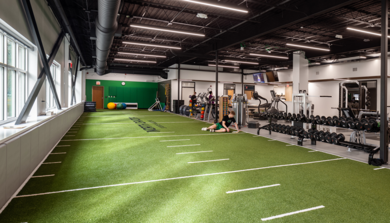 Thirty-yard turf area for sprints & calisthenics; physical therapy tables, weightlifting, and cardio; space supporting Biodex medical imaging technology; prep area with laundry and sinks