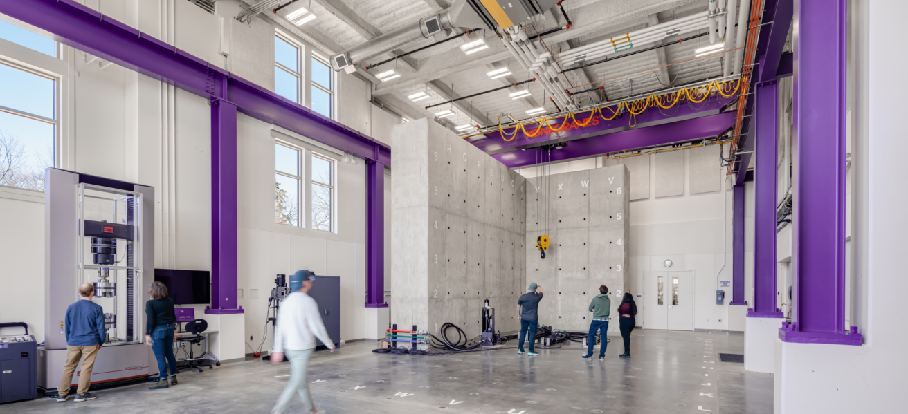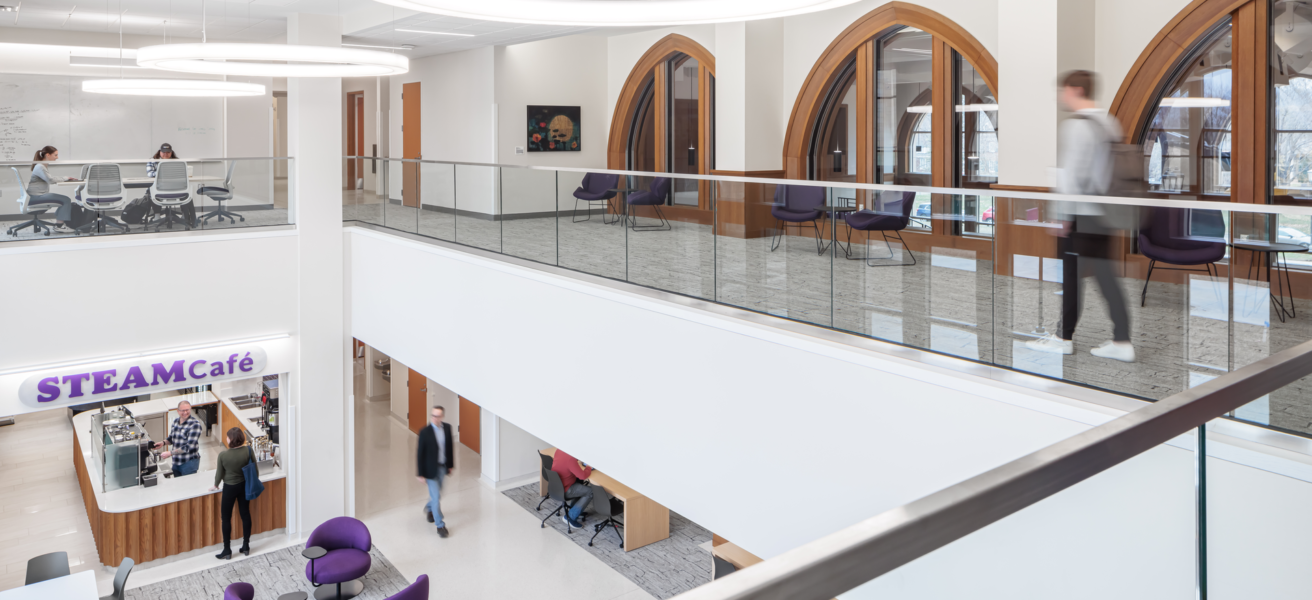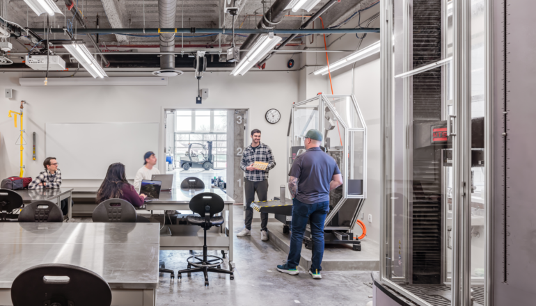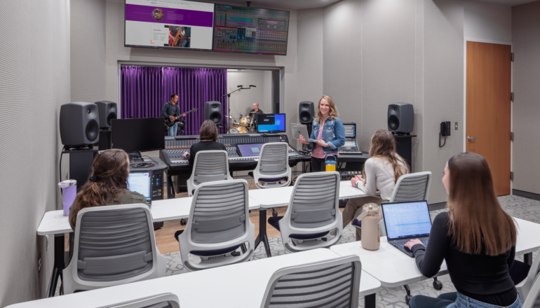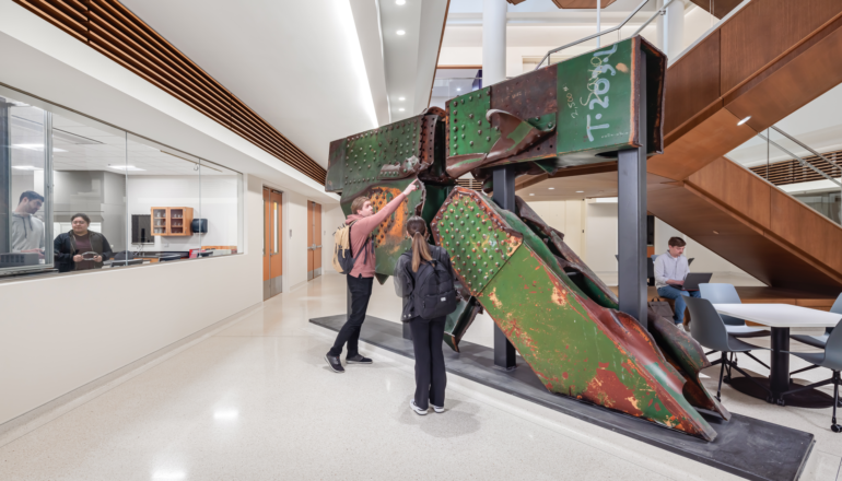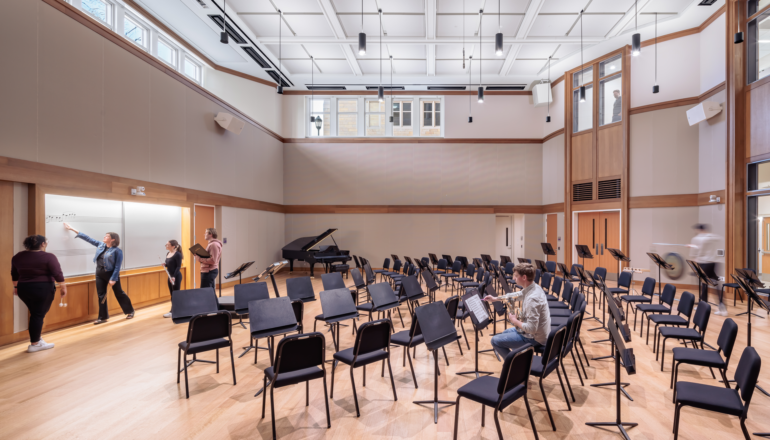Flexible and collaborative workspaces; two-story engineering bay with 20-foot crane for structural testing; labs for robotics, physics, biology, and chemistry; music rehearsal space that can accommodate a 100-piece orchestra; two-story chorale performance space for up to 150 people; emerging media program with newsroom and studios; art gallery; atrium; cafeteria
