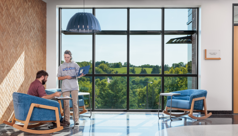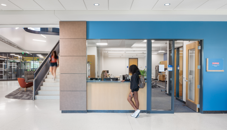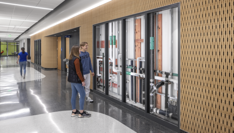 Essential design elements include a variety of lab spaces, building and site systems demonstration features, a green roof, space adjacencies for collaborative learning opportunities, and sustainable design features to pursue LEED certification. The facility is designed to expose structural and mechanical systems, as well as exterior visible stormwater management systems, which serve as hands-on learning tools.