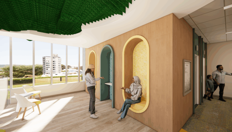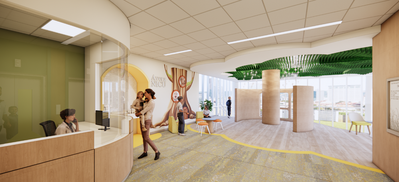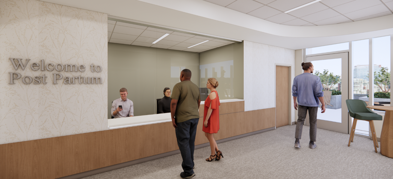 The experience of patients, staff, and family members was thoroughly considered in each space. Low-risk delivery rooms with tubs designed to feel more like home, amenity spaces for families, indoor and outdoor play spaces for children, and dedicated space for parents engaging in surrogacy or adoption thoughtfully address the individualized of needs of families. Each floor also includes break rooms, lactation rooms, and space for staff respite—all with the aim to focus on provider wellbeing within the center.